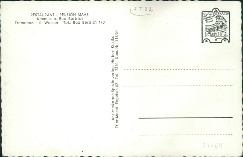 | Verlag | Ansichtskarten-Spezialverlag, Herbert Kostka, Trier-Mosel, Engelstr. 62, Tel. 2350 |