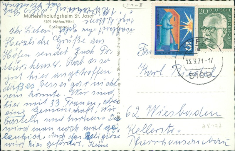 Alte Ansichtskarte aus Monschau-Höfen, gelaufen am 13.09.1971 von Höfen nach Wiesbaden.