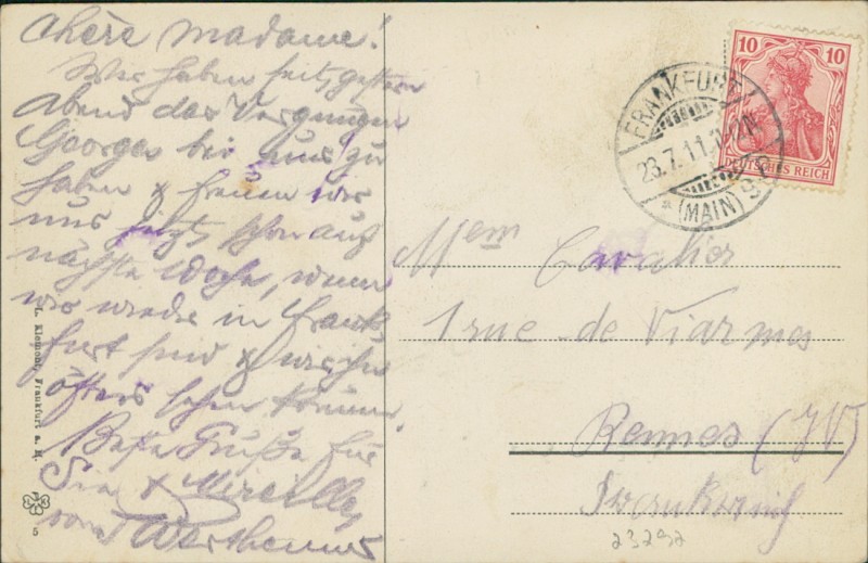 Alte Ansichtskarte aus Hofheim am Taunus, gelaufen am 23.07.1911 von Frankfurt (Main) nach Rennes.