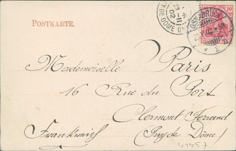 Alte Ansichtskarte aus Osnabrück, gelaufen am 21.11.1902 von Osnabrück nach Clermont-Ferrand.