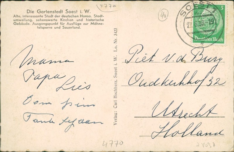 Alte Ansichtskarte aus Soest, gelaufen am 27.06.1938 von Soest nach Utrecht.