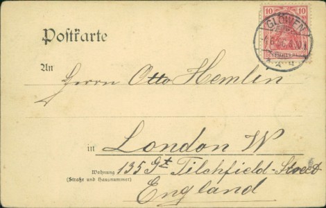 Alte Ansichtskarte aus Havelberg, gelaufen am 04.06.1906 von Glöwen nach London.