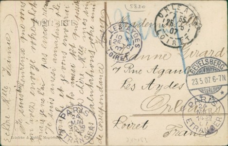Alte Ansichtskarte aus Gevelsberg, gelaufen am 23.05.1907 von Gevelsberg nach Orlean. Ankunft in Orlean am 25.05.1907.