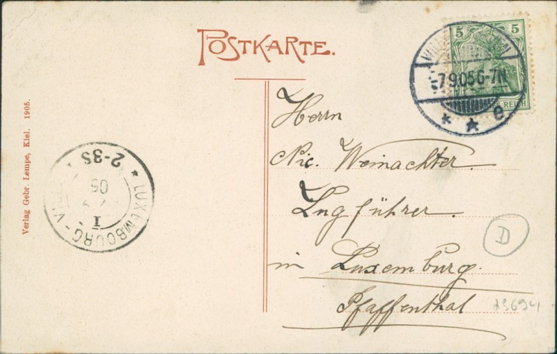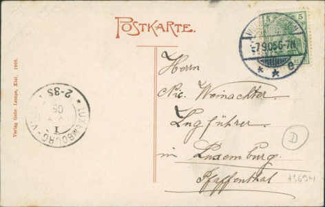 Alte Ansichtskarte, gelaufen am 07.09.1905 von Wilhelmshaven nach Luxemburg.