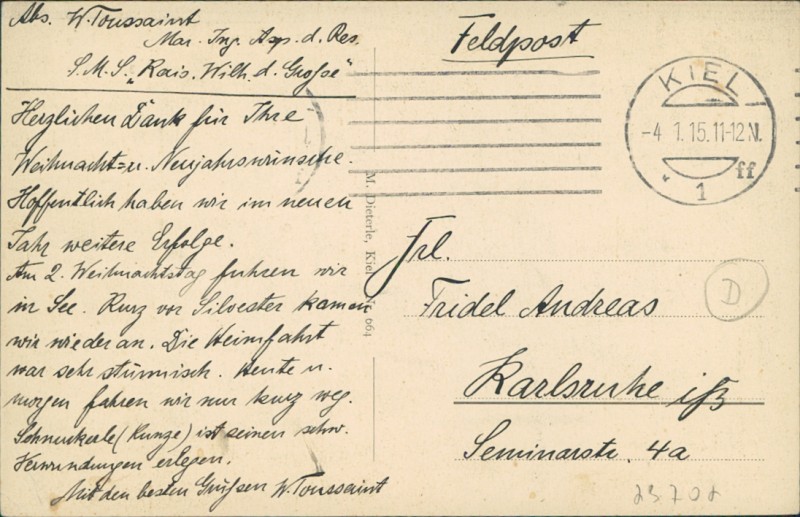 Alte Ansichtskarte, gelaufen am 04.01.1915 von Kiel nach Karlsruhe i/B.