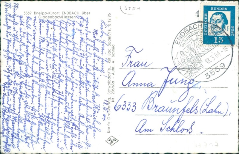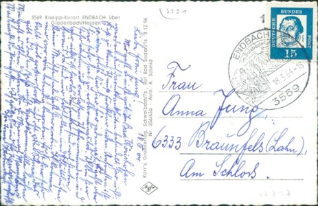 Alte Ansichtskarte aus Bad Endbach, gelaufen am 18.03.1964 von Endbach nach Braunfels (Lahn).