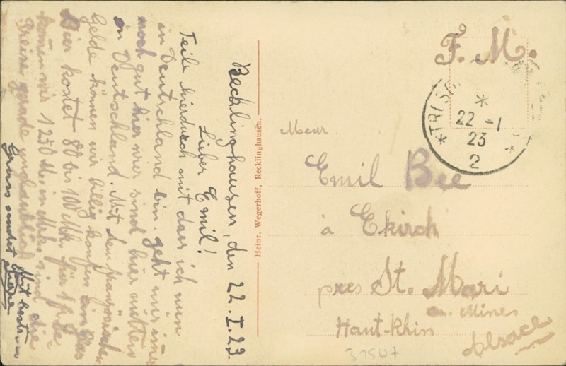 Alte Ansichtskarte aus Recklinghausen, gelaufen am 22.01.1923.
